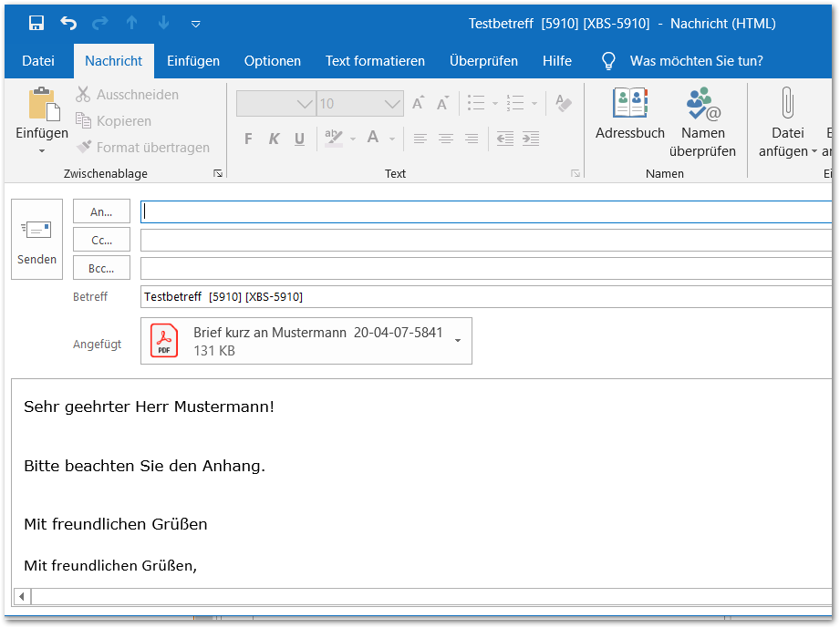 Wird unter Einstellungen/Konfiguration/Benutzereinstellungen m3/Mailstandardtext ein Text hinterlegt, wird dieser im Zuge dieser hier erläuterten Mail-Erstellung als Mailtext herangezogen.