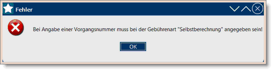 Achtung: Wird die Vorgangsnummer in dafür vorgesehenen Feld eingegeben, jedoch bei den Gebühren nicht korrekterweise Selbstberechnung ausgewählt, wird folgende Meldung beim Versuch dieses Begehren zu speichern, ausgegeben: