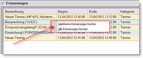 In der Maske Erinnerung, welche alle zum Zeitpunkt der Öffnung fälligen Kalendereinträge mit Erinnerung auflistet, besteht über die rechte Maustaste (Kontextmenü) die Funktion diese aufgelisteten Erinnerungen einzeln oder auch gesammelt zu löschen.