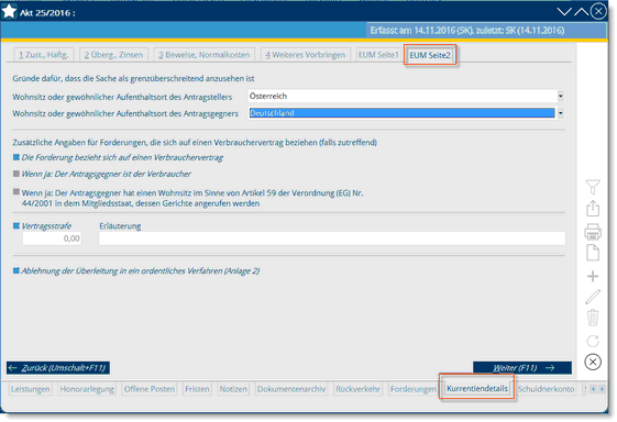 Im weiteren Reiter EUM Seite 2 sind Angaben zu tätigen, warum die Forderung als grenzüberschreitend anzusehen ist, ob es sich um einen Verbrauchervertrag handelt, eine Vertragsstrafe geltend gemacht oder die Überleitung in ein ordentliches Verfahrens abgelehnt wird.